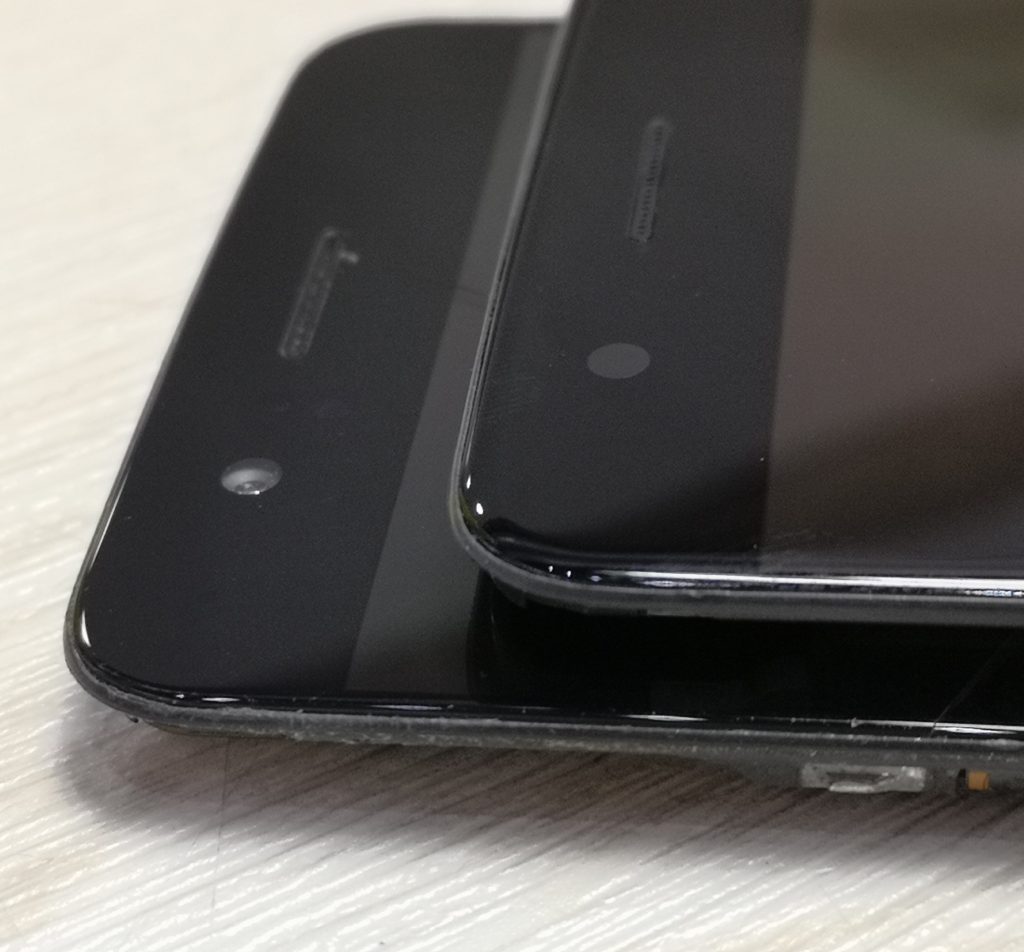 左為非原裝屏幕,玻璃較薄且扁平,沒有3D弧度