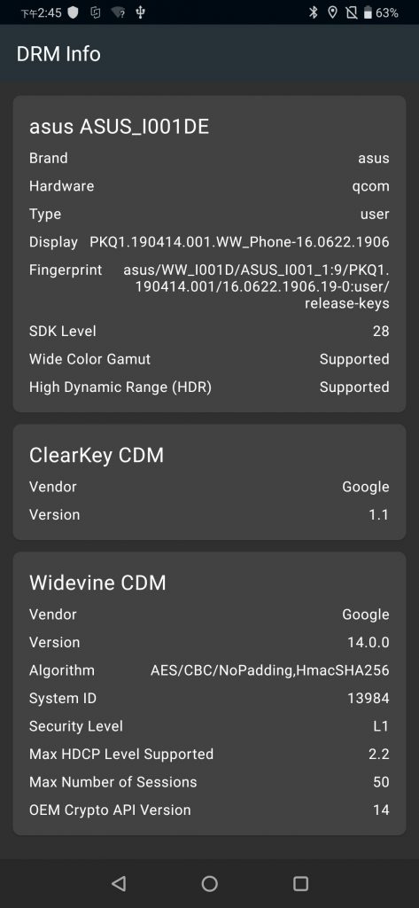 ROG 2 國內版轉換國際版系統後 DRM Security Level L1